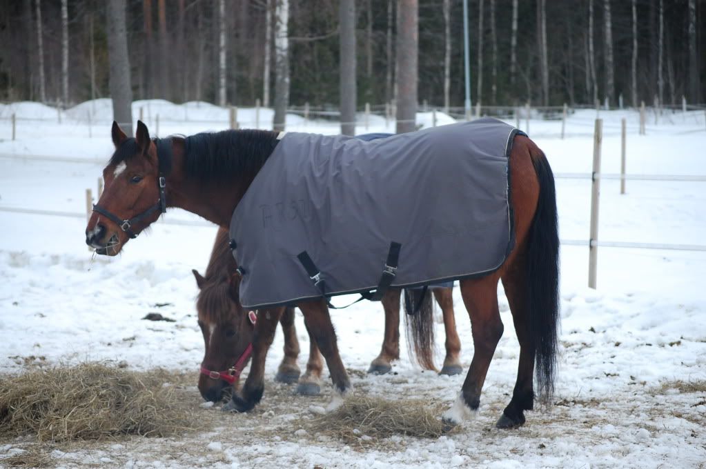 Mentiin perjantaina Vilman kans tallil jo puol neljält ja meit odotti ihana yllätys siel... Veikka oli piehtaroinu kurasel laitumel, koko hevonen ihan kuranen ! Jopa pää ja korvat iha kuraset.. Siin meni joku puolisen tuntii et saatii suurimmat kurat pois. Kentällä mentii ravissa paljon temponlisäyksiä ja kuunteli lopuks hienost ! Välil tuntus et se ois vähä laiska eikä sitä kiinnostais yhtää mun avut. Laukka ei oikee sujunu, ryntäs vaa ain Hilsun lähel ja oli muutenki iha mahdoton. Sähläs koko aja. Laukat kyl nousi tosi hyvinn ! (: